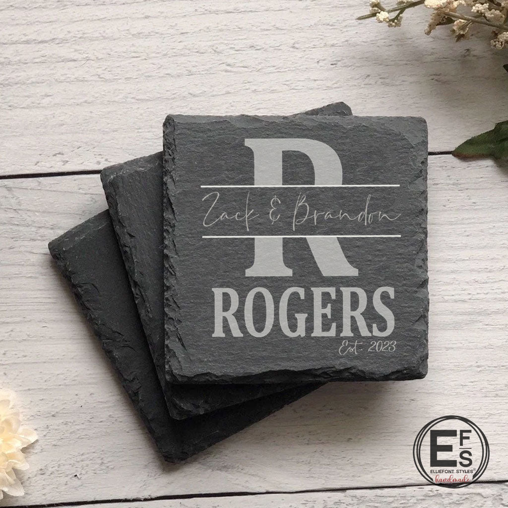 Give a gift that’s as unique as the couple with our Personalized Split Monogram Slate Coasters. Each coaster is laser engraved with a split monogram, the couple’s first names, and the family last name, creating a beautifully personalized keepsake for any home.